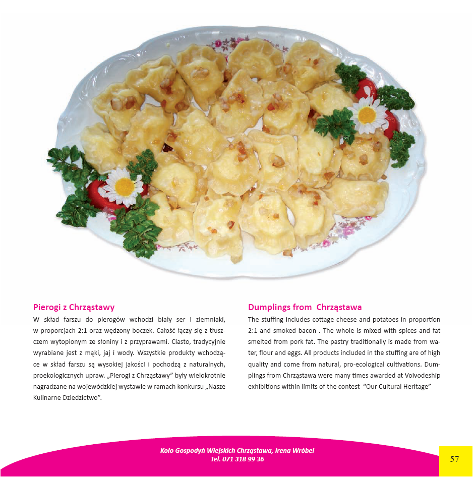 Pierogi słynne ze znakomitego farszu, które przygotowywane są przez Koło Gospodyń Wiejskich w Chrząstawie. Farsz do pierogów składa się z białego sera i ziemniaków w proporcji 2:1 oraz wędzony boczek w połączeniu z tłuszczem ze słoniny i przyprawami. Wszystkie produkty na farsz pochodzą z upraw regionalnych. Zdobyły wiele nagród, w tym I miejsce w Konkursie Nasze Kulinarne Dziedzictwo - Smaki Regionów w 2021 r.