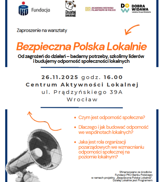 Na te kluczowe pytania wspólnie poszukamy odpowiedzi na spotkaniu dla organizacji pozarządowych, przeprowadzonym przez Fundację PKO Banku Polskiego oraz Lokalną Grupę Działania Dobra Widawa – realizatora programu „Działaj Lokalnie” Polsko-Amerykańskiej Fundacji Wolności.