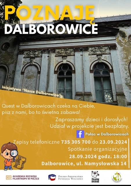 Działania: W ramach projektu zorganizowany został wykład audiowizualny dla beneficjentów projektu, który dotyczył dziedzictwa kulturowego, historii, przyrody, krajoznawstwa i potencjału turystycznego wsi Dalborowice. Przeprowadzone zostało również spotkanie instruktażowe dotyczące pisania questów. Oba te wydarzenia przygotowały mieszkańców do opracowania treści questu po Dalborowicach. Po ukończeniu wszystkich prac zorganizowany został spacer dla uczestników projektu i zaproszonych gości z wykorzystaniem nowopowstałego questu po Dalborowicach, zakończony uroczystym podsumowaniem projektu.